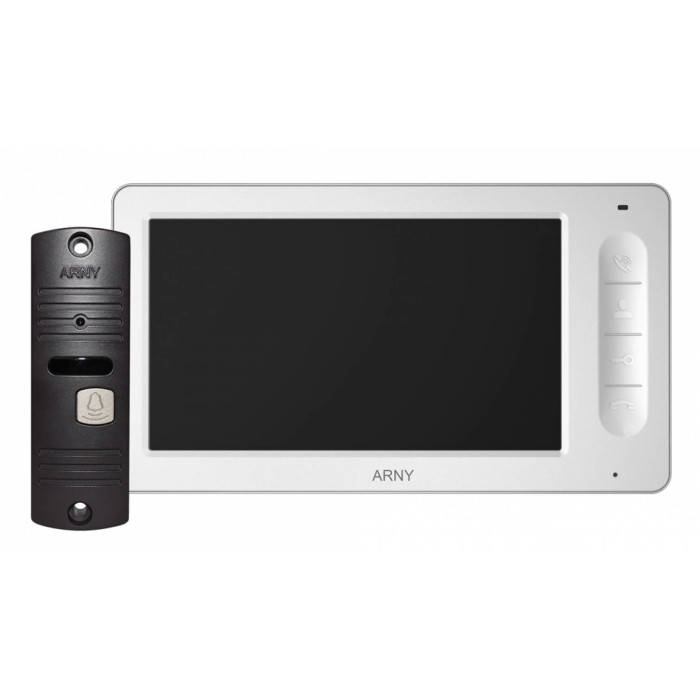Комплект ARNY AVD-7005 (білий/коричневий) складається з кольорового відеодомофону AVD-705 з монітором 7 дюймів та сенсорними кнопками управління та кольорової панелі виклику AVP-05