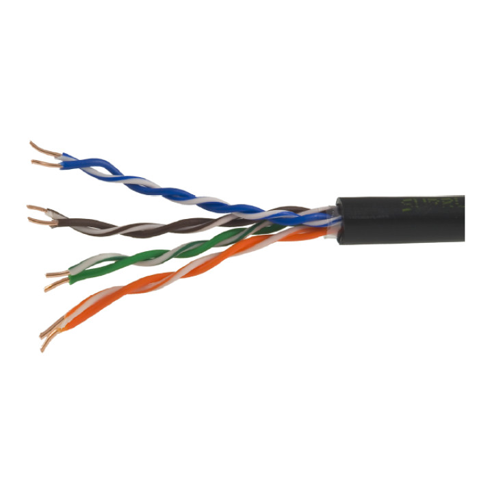 Кабель кручена пара UTP 4*2*0.5-CU PE , категорія 5е. Чи не екранований. Матеріал провідника – мідь (Сu). Діаметр жили 0,5 мм, оболонка поліетилен, упаковка 305м, колір темний, всього 8 жил для передачі інформації, такий кабель часто застосовується в локальних мережах, а так само в слабко системах безпеки. Напруга – до 60В. Опір 28 Ом/305м. Купити не дорого кабель кручена пара UTP 4*2*0.5-CU PE , можна в нашому інтернет магазині охоронних систем "Контур".