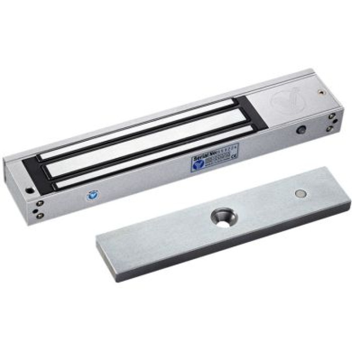 Електромагнітний замок з таймером затримки, світловою індикацією, датчиком стану дверей, накладною, сила утримання 280кг, час затримки 0,3,6,9 сек, живлення: DC12V/500mA, DC24V/250mA. Розміри: 250х48, 5х25 мм. Підходить для дерев'яних, скляних, металевих та протипожежних дверей.