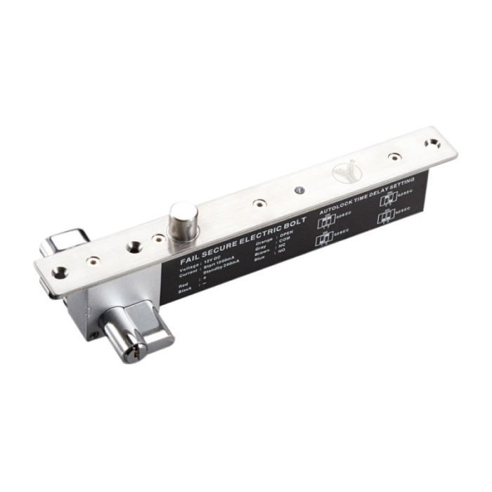 Врізний електроригельний замок із циліндром із нержавіючої сталі. Нормально закрита (NC). Вбудований таймер затримки закриття дверей: 0,3,6 та 9 сек, LED-підсвічування та датчик стану дверей. Максимальна відстань спрацьовування 8мм. Робочий струм: 1200мА, в режимі очікування: 200мА. Живлення 12В. Розміри 260x30x48мм.
