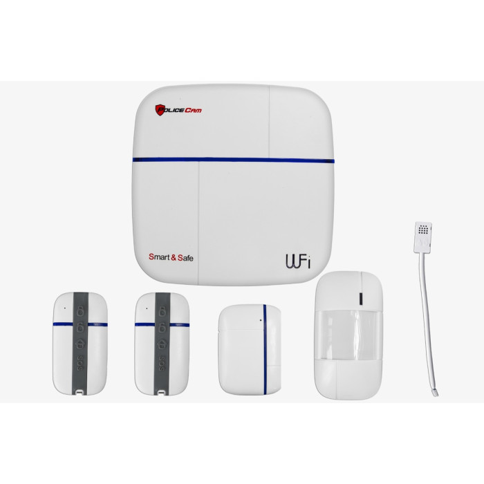 Бездротова сигналізація Smart&Safe 868 Комплект Wi-Fi GSM PoliceCam. Підтримує 2 канали передачі даних, GSM та WiFi. Частота роботи датчиків руху, відкриття, 868 МГц. Частоти мобільного оператора GSM: 900/1800/850/1900 МГц. Напруга живлення системи: 220V змінного струму, блок постійного струму напругою 12V, 1000mA. Потужність, струм <100 mA в черговому режимі. Вбудований літійіонний акумулятор 7,4V/800mAh. Час роботи від акумулятора до 10:00. Робоча температура -100 ~ 550 С. Розміри: 145мм x 145мм x 26мм. Дальність роботи із датчиками у відкритому просторі до 100 метрів.