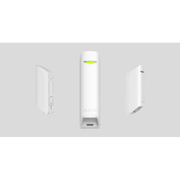 Бездротовий ІЧ-датчик руху типу "штора" Ajax MotionProtect Curtain з 2 PIR-сенсорами. Дальність детекції – 11 м, кут огляду вертикальний – 90°, горизонтальний – 6°. 3 рівні чутливості. Не реагує на тварин зростом до 40 см та вагою до 15 кг. Дальність зв'язку з централлю до 1700м (на відкритому просторі). Ajax MotionProtect Curtain відмінний датчик для захисту периметра в приміщенні, встановлюється на укосі вікна або стінки, де є необхідність контролювати вікна або двері. Висота установки датчика від рівня підлоги не нижче 40 см. Колір корпусу – білий. Максимальна дальність виявлення людини до 15 метрів. Термін служби батарейки в датчику Ajax MotionProtect Curtain складає до 5 років роботи. Працює датчик з усіма централями Ajax HUB . Корупса датчика є білого та чорного кольору.