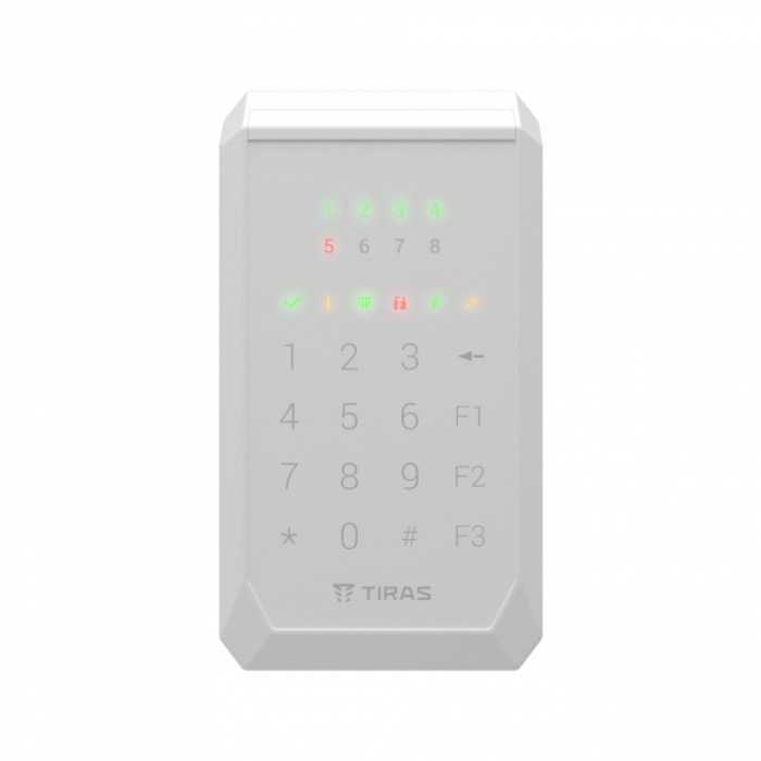 Дана клавіатура повинна підключатися кабелем "кручена пара", до основного блоку ППК. Підібрати охоронний прилад для даної клавіатури можна ТУТ , дизайн. Особливістю клавіатури є вбудований зчитувач NFC/Mifare для встановлення зняття об'єкта з охорони. Клавіатури дуже сучасний, так само дана модель випускається в чорному та білому кольорі.