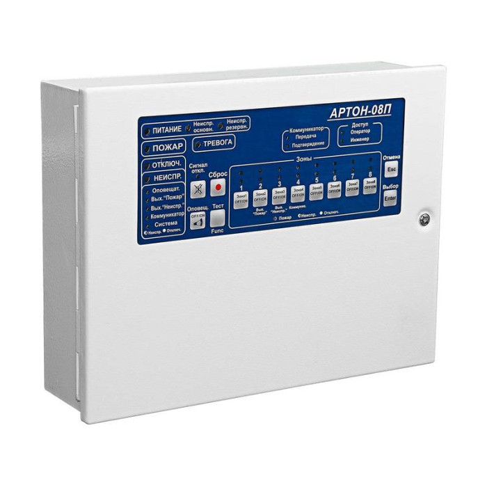 ППКП-08П від компанії Артон застосовуються при створенні автономної або централізованої пожежної охорони на об'єкті та забезпечують цілодобовий контроль стану за 8 шлейфами сигналізації. Даний прилад дозволяє визначити та відобразити кілька станів шлейфу: Увага (при спрацюванні першого сповіщувача у шлейфі сигналізації), Пожежа, Черговий режим, Шлейф вимкнений, Несправність при короткому замиканні, а також у разі обриву. Пристрій дозволяє підключити в один ШС активні та пасивні сповіщувачі та побудувати комбіновані шлейфи сигналізації використовуючи 2 та 4 провідні схеми підключення. Варто зазначити, що кожен із шлейфів приладу можна налаштувати як пожежний без або з верифікацією, із спрацюванням 2 сповіщувачів, а також можна встановити залежності типу А, B, C. Прилад приймально-контрольний пожежний розрахований на підключення до 32 активних сповіщувачів у кожний шлейф сигналізації . У моделі присутні виходи: Оповіщення, Несправність, Пожежа, 2 програмовані сильноточні виходи AUX1 і AUX2, 2 програмовані реле, а також є вхід для підключення зовнішнього резервного джерела живлення. Програмування пристрою можливе за допомогою комп'ютера. Артон ППКП-08П дозволить визначити стан і несправність у разі короткого замикання вихідних ключів, за відсутності напруги, розряду або виходу з ладу акумулятора та оперативно усунути проблеми, що виникли.