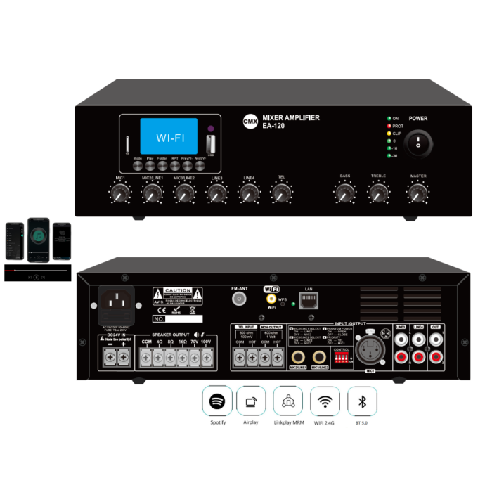 EA-120W — це багатофункціональний мікшуючий підсилювач із Wi-Fi, розроблений для організації якісного звукового озвучення в одній зоні. Завдяки потужності 120 Вт, широким можливостям підключення та функції віддаленого керування через мобільний застосунок, цей підсилювач стане ідеальним рішенням для офісів, магазинів, ресторанів, навчальних закладів або приватних приміщень.